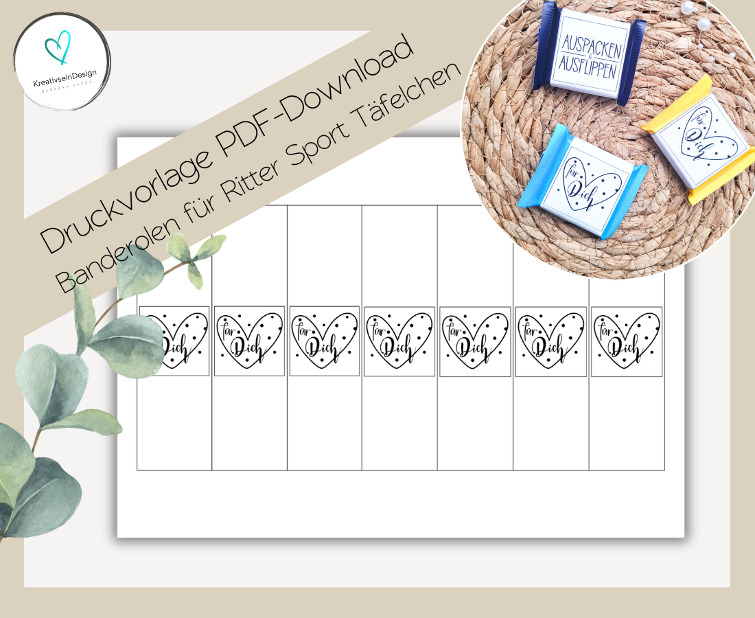 Mit dieser liebevoll gestalteten PDF-Druckvorlage gestaltest du im Handumdrehen hübsche Banderolen für Mini-Rittersport Täfelchen – perfekt als kleine Aufmerksamkeit, Dankeschön, Tischdeko oder Mitbringsel.