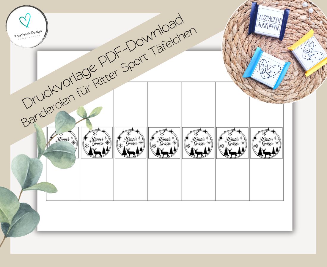 PDF-Druckvorlage: Banderolen für Mini-Rittersport Täfelchen – süße Geschenkidee zum Ausdrucken