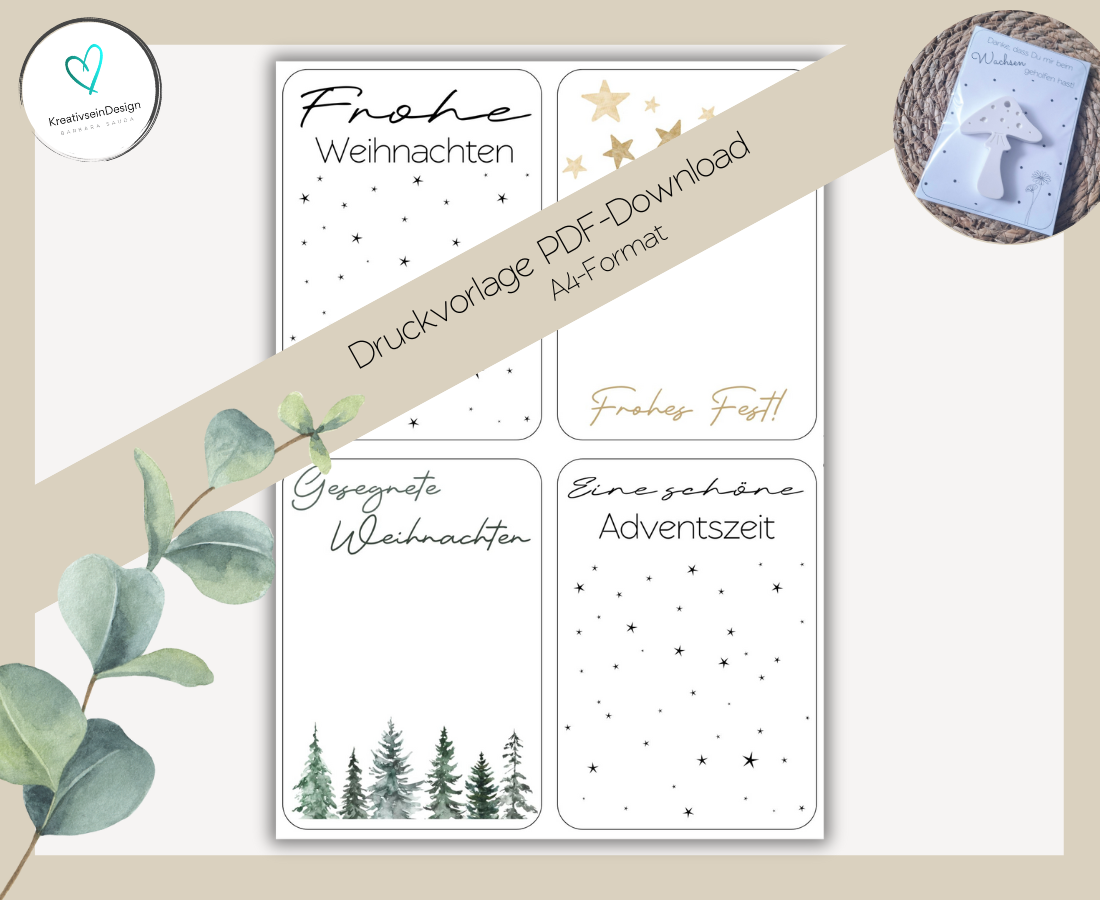Die Vorlage enthält vier A6-Kärtchen im Hochformat auf einer A4-Seite. Einfach downloaden, auf deinem Wunschpapier (z. B. Kraftpapier 200g) ausdrucken, ausschneiden – und nach Belieben weiterverarbeiten.