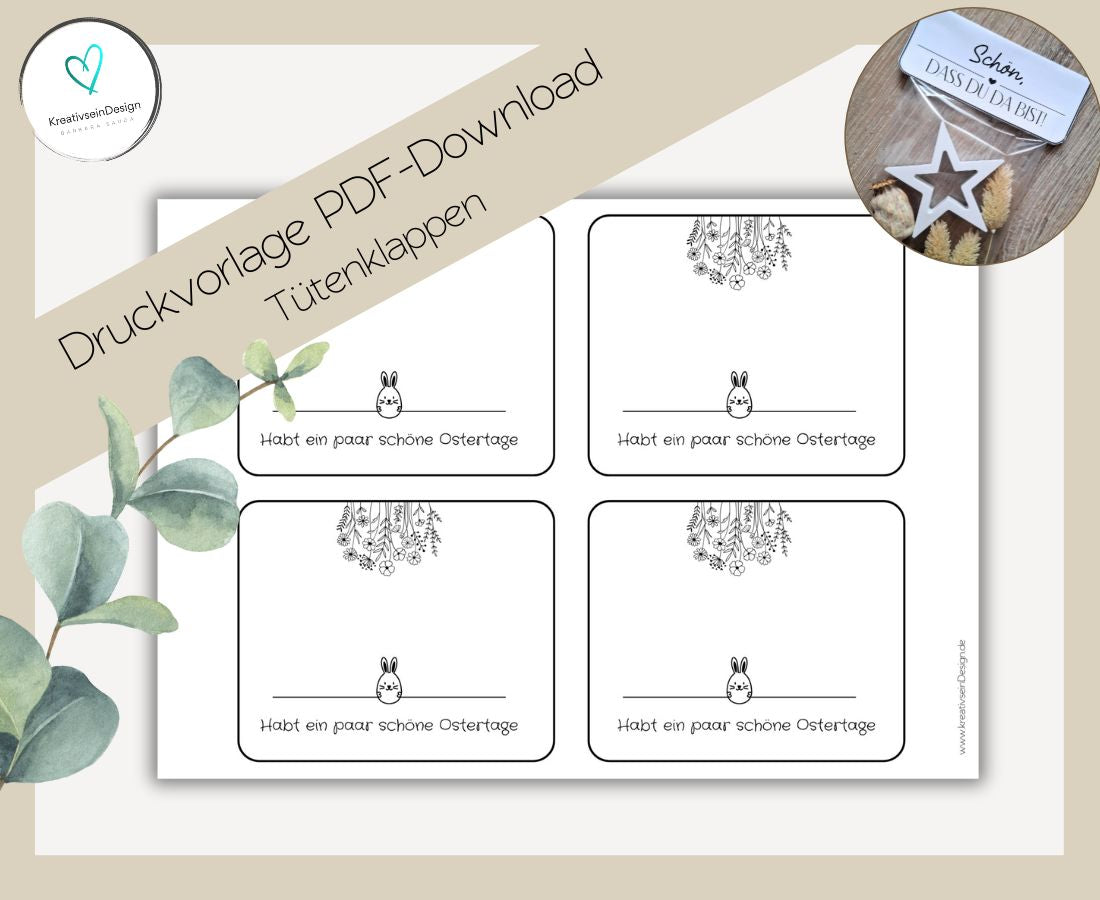Lade nach dem Kauf die Datei herunter, drucke sie auf festem Papier (z. B. Kraftpapier ab 200 g) aus, schneide die Tütenklappen aus, falte sie in der Mitte und befestige sie mit doppelseitigem Klebeband oder einem Tacker an deiner befüllten Tüte – fertig ist dein individuelles Mitbringsel.