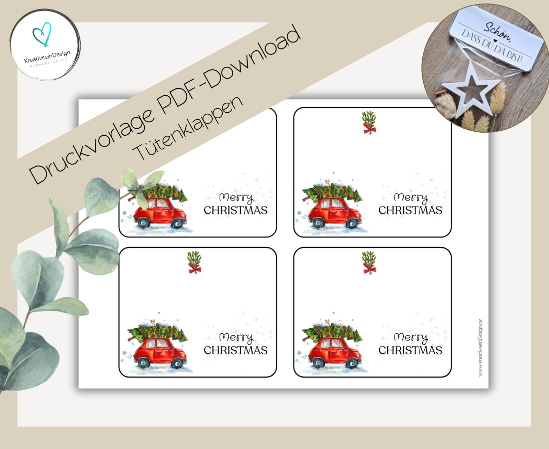 Lade nach dem Kauf die Datei herunter, drucke sie auf festem Papier (z. B. Kraftpapier ab 200 g) aus, schneide die Tütenklappen aus, falte sie in der Mitte und befestige sie mit doppelseitigem Klebeband oder einem Tacker an deiner befüllten Tüte – fertig ist dein individuelles Mitbringsel.