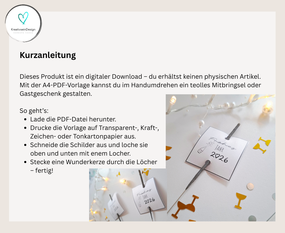 Mit dieser liebevoll gestalteten PDF-Druckvorlage verwandelst du einfache Wunderkerzen in kleine, persönliche Geschenke. Die Schildchen eignen sich perfekt als Mitbringsel, als Gastgeschenke für Feiern oder als besondere Aufmerksamkeit zu vielen Anlässen – von Geburtstag über Hochzeit bis hin zu Silvester oder kleinen Dankeschön-Momenten.
