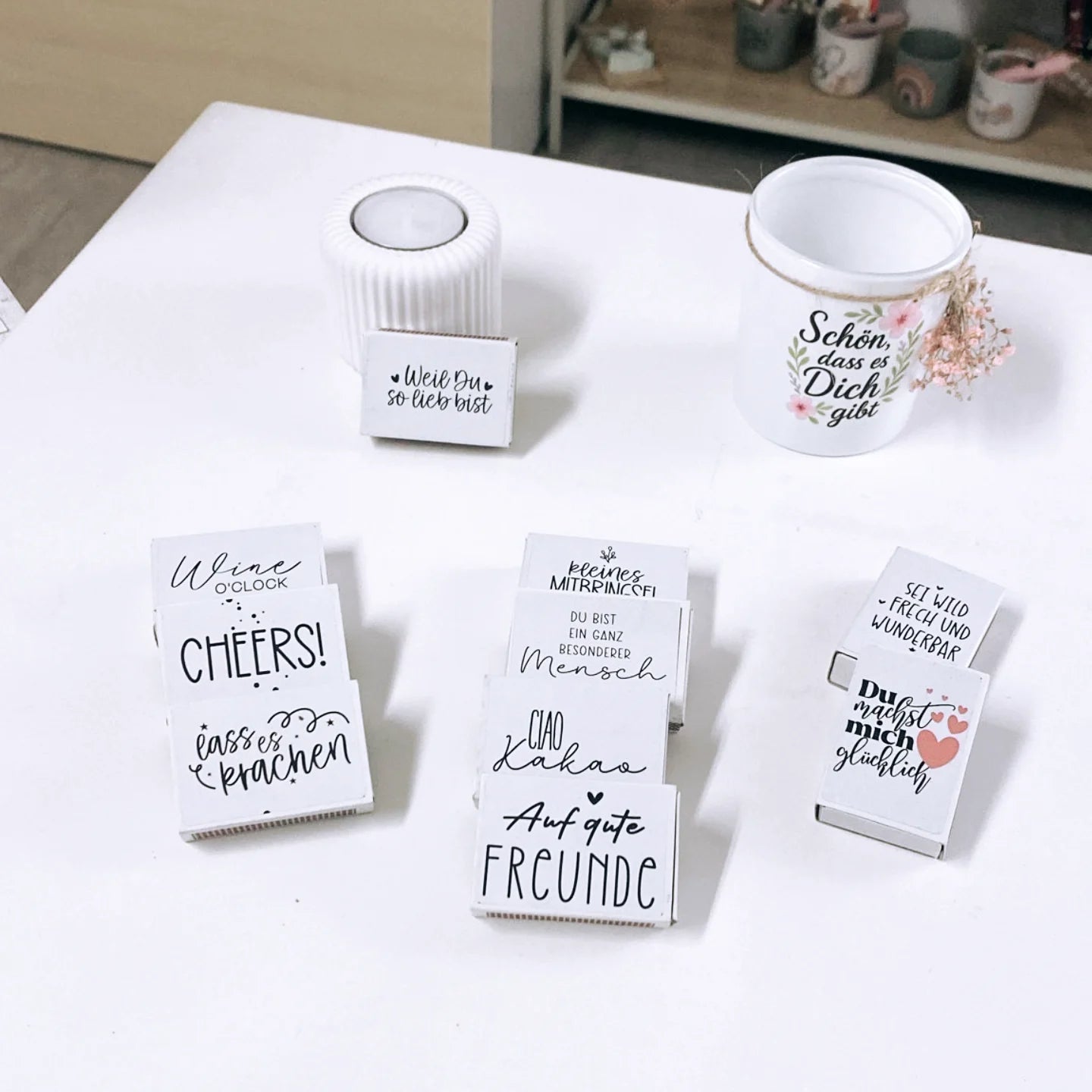 Auf gefüllten Streichholzschachteln mit echten Streichhölzern: Perfekt kombinierbar mit Kerzengeschenken – z. B. als liebevolles DIY-Set mit Kerze und Streichhölzern.