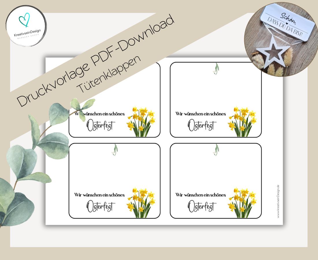 Lade nach dem Kauf die Datei herunter, drucke sie auf festem Papier (z. B. Kraftpapier ab 200 g) aus, schneide die Tütenklappen aus, falte sie in der Mitte und befestige sie mit doppelseitigem Klebeband oder einem Tacker an deiner befüllten Tüte – fertig ist dein individuelles Mitbringsel.