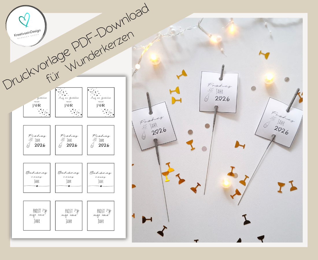 Mit dieser liebevoll gestalteten PDF-Druckvorlage verwandelst du einfache Wunderkerzen in kleine, persönliche Geschenke. Die Schildchen eignen sich perfekt als Mitbringsel, als Gastgeschenke für Feiern oder als besondere Aufmerksamkeit zu vielen Anlässen – von Geburtstag über Hochzeit bis hin zu Silvester oder kleinen Dankeschön-Momenten.