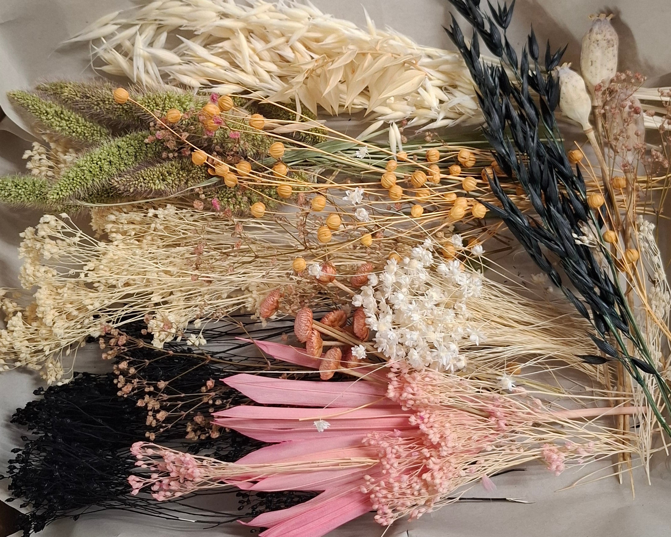 Inhalt: Vielfältige Mischung aus farblich abgestimmten Trockenblumen