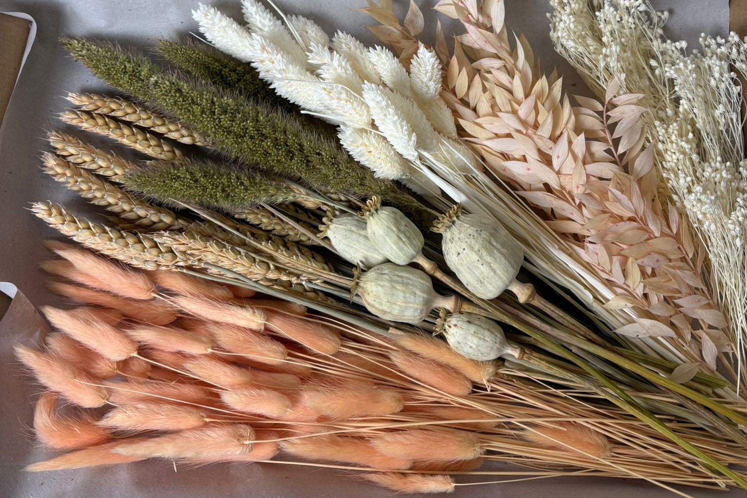 Inhalt: Vielfältige Mischung aus farblich abgestimmten Trockenblumen